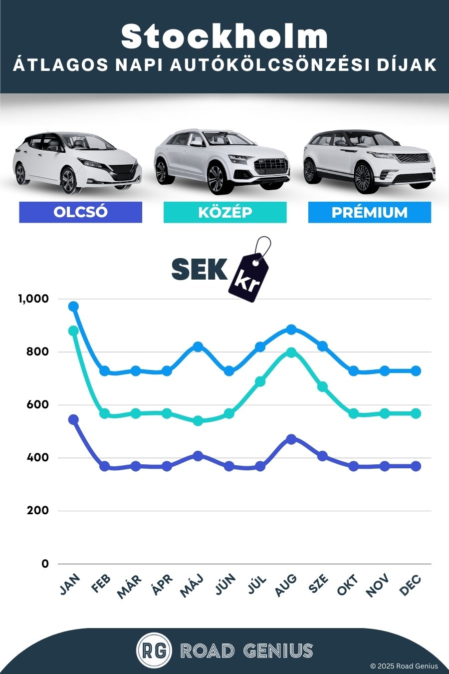 Átlagosan az autóbérlés Stockholm-ban körülbelül 604 kr naponta kerül, a legolcsóbb bérleti díjak pedig 369 kr-tól indulnak naponta.