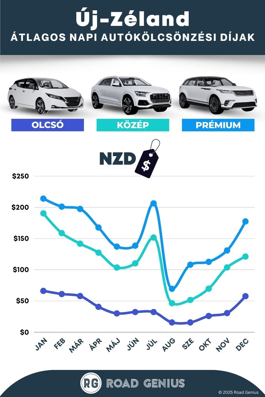 Átlagosan az autóbérlés New Zealand-en körülbelül NZD $103 naponta kerül, a legolcsóbb bérleti díjak pedig NZD $16-tól indulnak naponta.