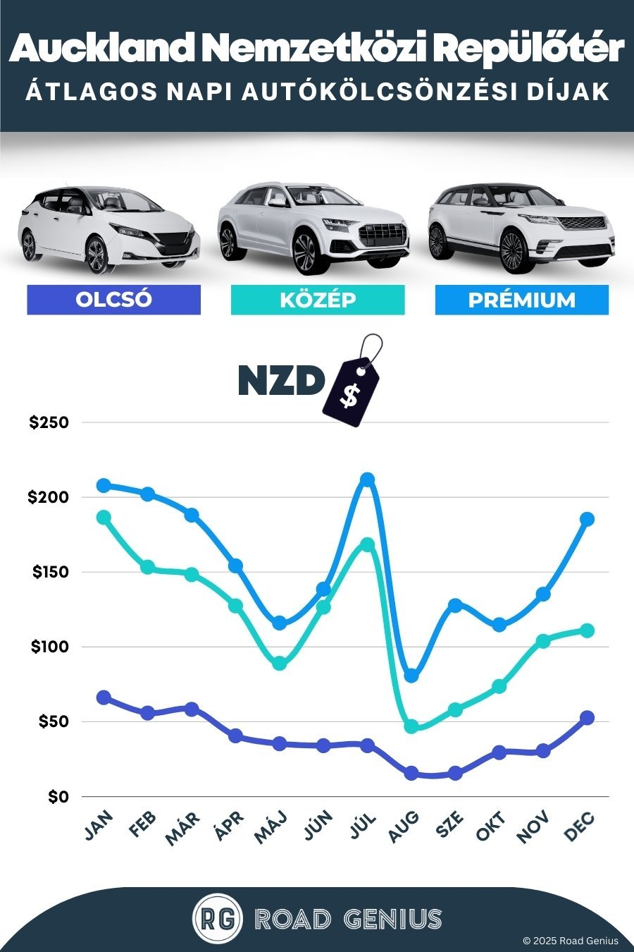 Átlagosan az autóbérlés Auckland Airport (International)-on körülbelül NZD $103 naponta kerül, a legolcsóbb bérleti díjak pedig NZD $16-tól indulnak naponta.