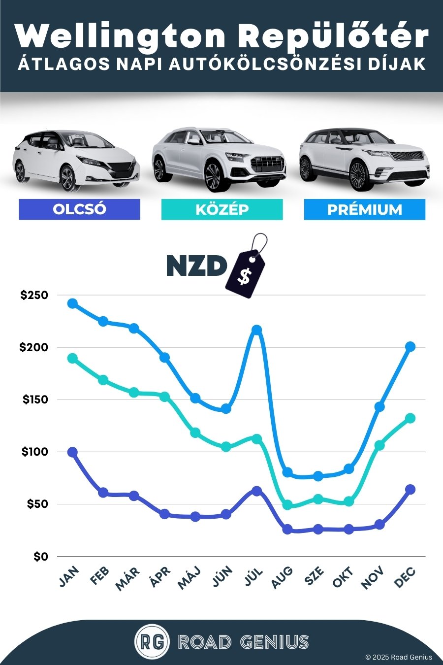 Átlagosan az autóbérlés Wellington Airport-on körülbelül NZD $109 naponta kerül, a legolcsóbb bérleti díjak pedig NZD $26-tól indulnak naponta.