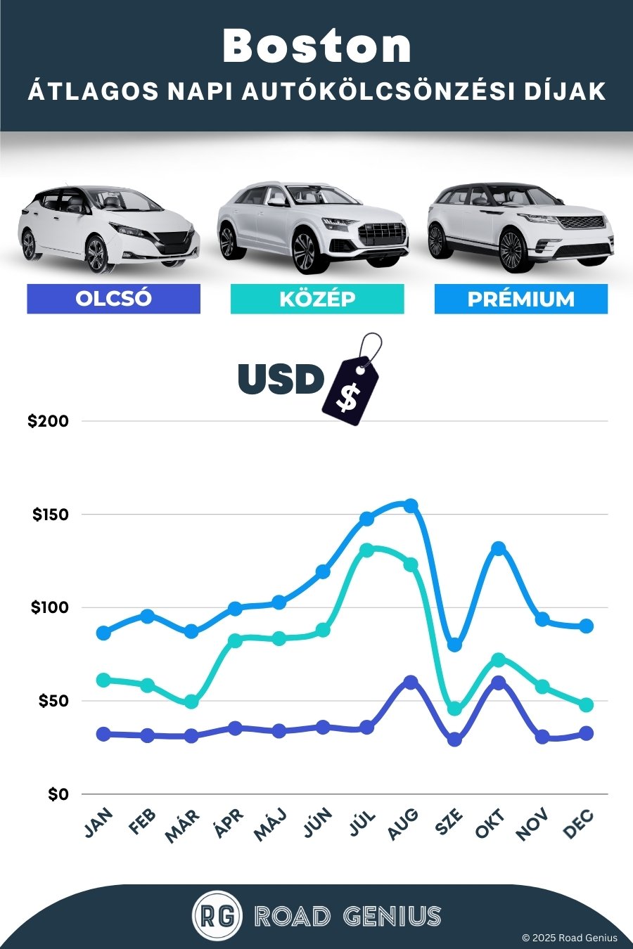Átlagosan az autóbérlés Boston-ban körülbelül USD $73 naponta kerül, a legolcsóbb bérleti díjak pedig USD $29-tól indulnak naponta.