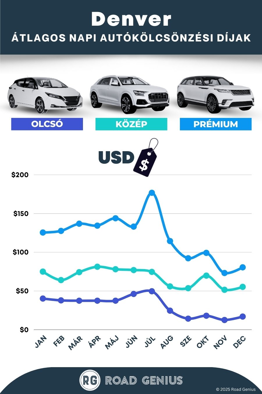 Átlagosan az autóbérlés Denver-ben körülbelül USD $73 naponta kerül, a legolcsóbb bérleti díjak pedig USD $13-tól indulnak naponta.