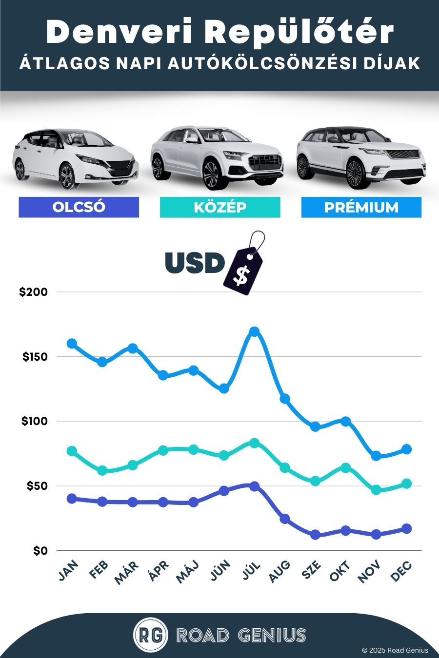 Átlagosan az autóbérlés Denver Airport-on körülbelül USD $74 naponta kerül, a legolcsóbb bérleti díjak pedig USD $12-tól indulnak naponta.