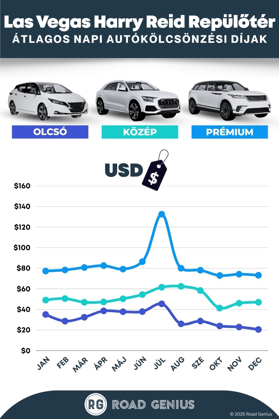 Átlagosan az autóbérlés Las Vegas Harry Reid Airport-on körülbelül USD $55 naponta kerül, a legolcsóbb bérleti díjak pedig USD $21-től indulnak naponta.