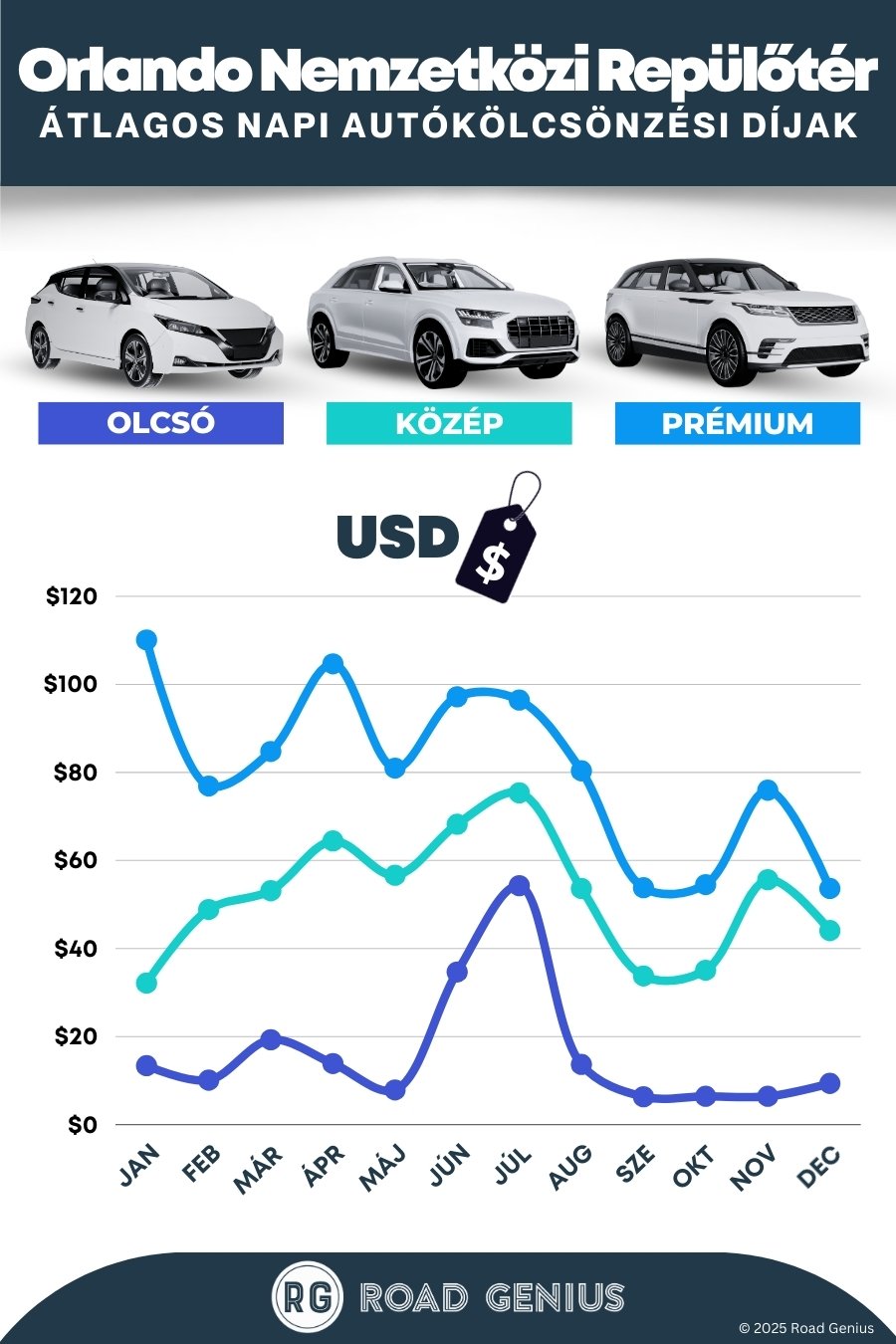 Átlagosan az autóbérlés Orlando International Airport-on körülbelül USD $50 naponta kerül, a legolcsóbb bérleti díjak pedig USD $6-tól indulnak naponta.