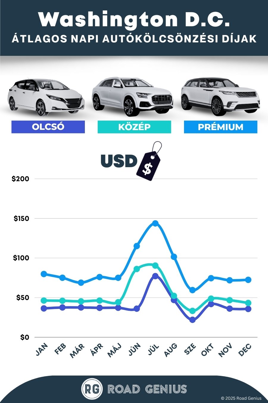 Átlagosan az autóbérlés Washington DC-ben körülbelül USD $59 naponta kerül, a legolcsóbb bérleti díjak pedig USD $22-től indulnak naponta.