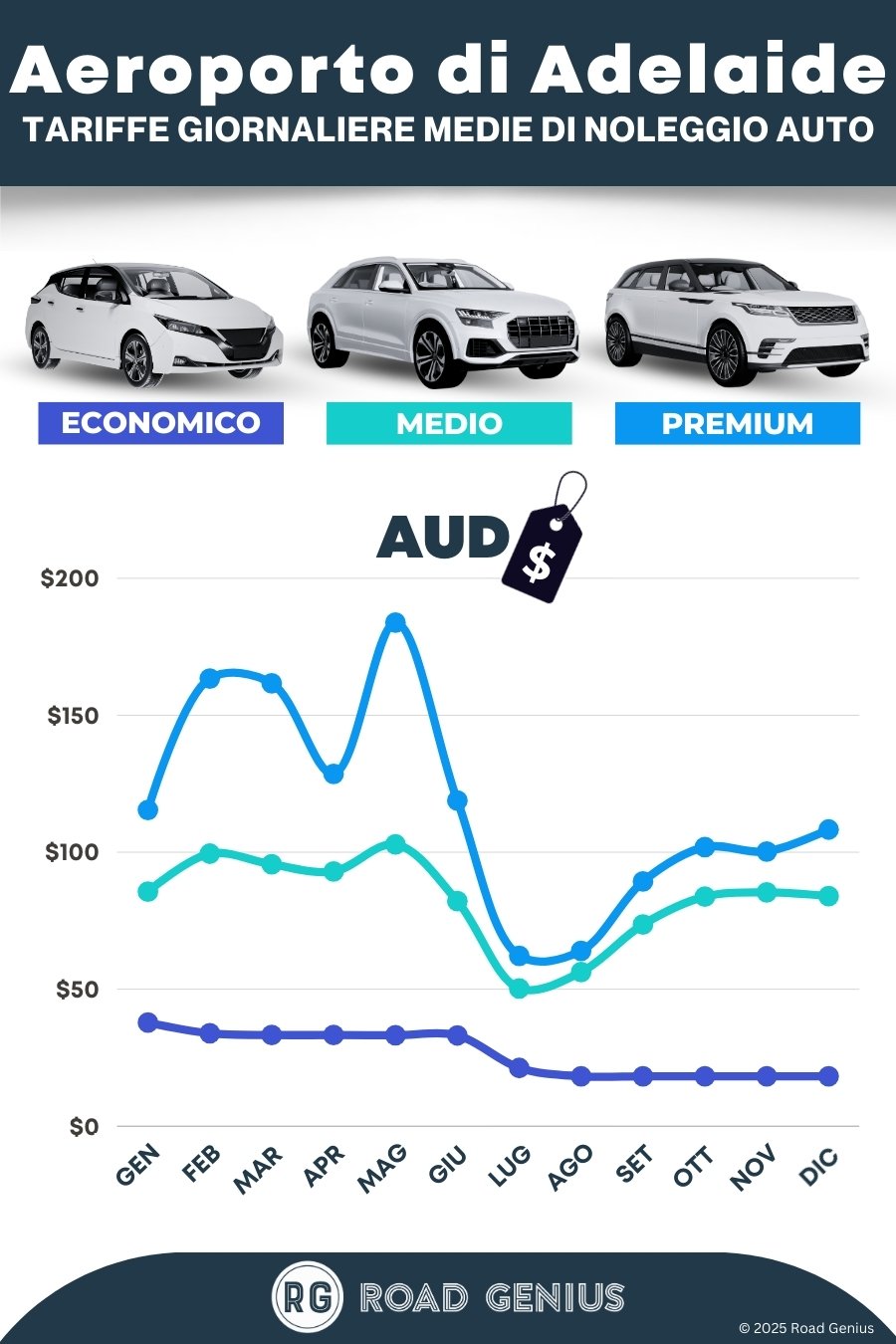 In media, il noleggio di un’auto presso l’Aeroporto di Adelaide (ADL) costa circa AUD 100 al giorno, con tariffe a partire da AUD 18 al giorno.