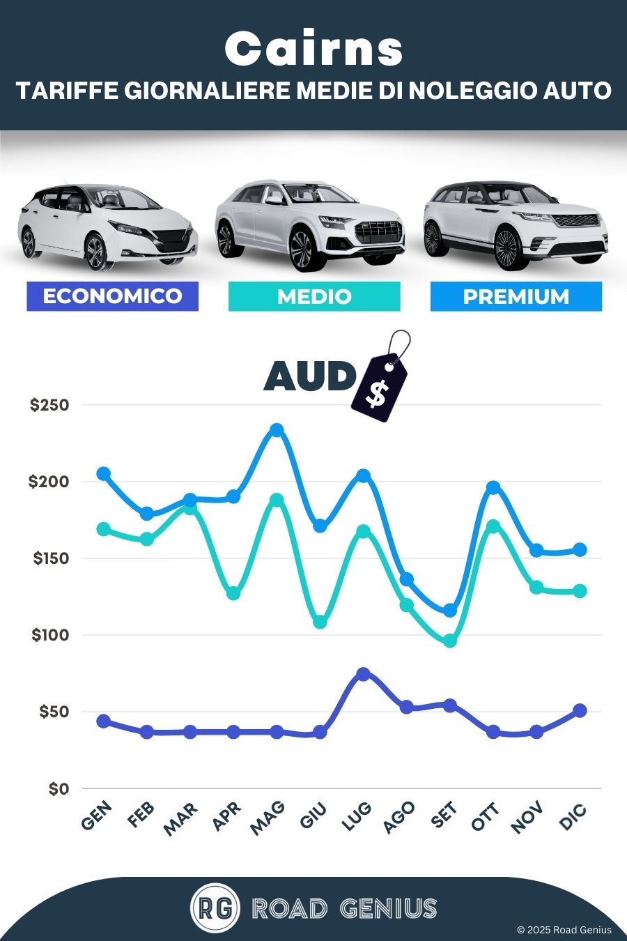 In media, il noleggio di un’auto a Cairns costa circa AUD 157 al giorno, con tariffe a partire da AUD 37 al giorno.