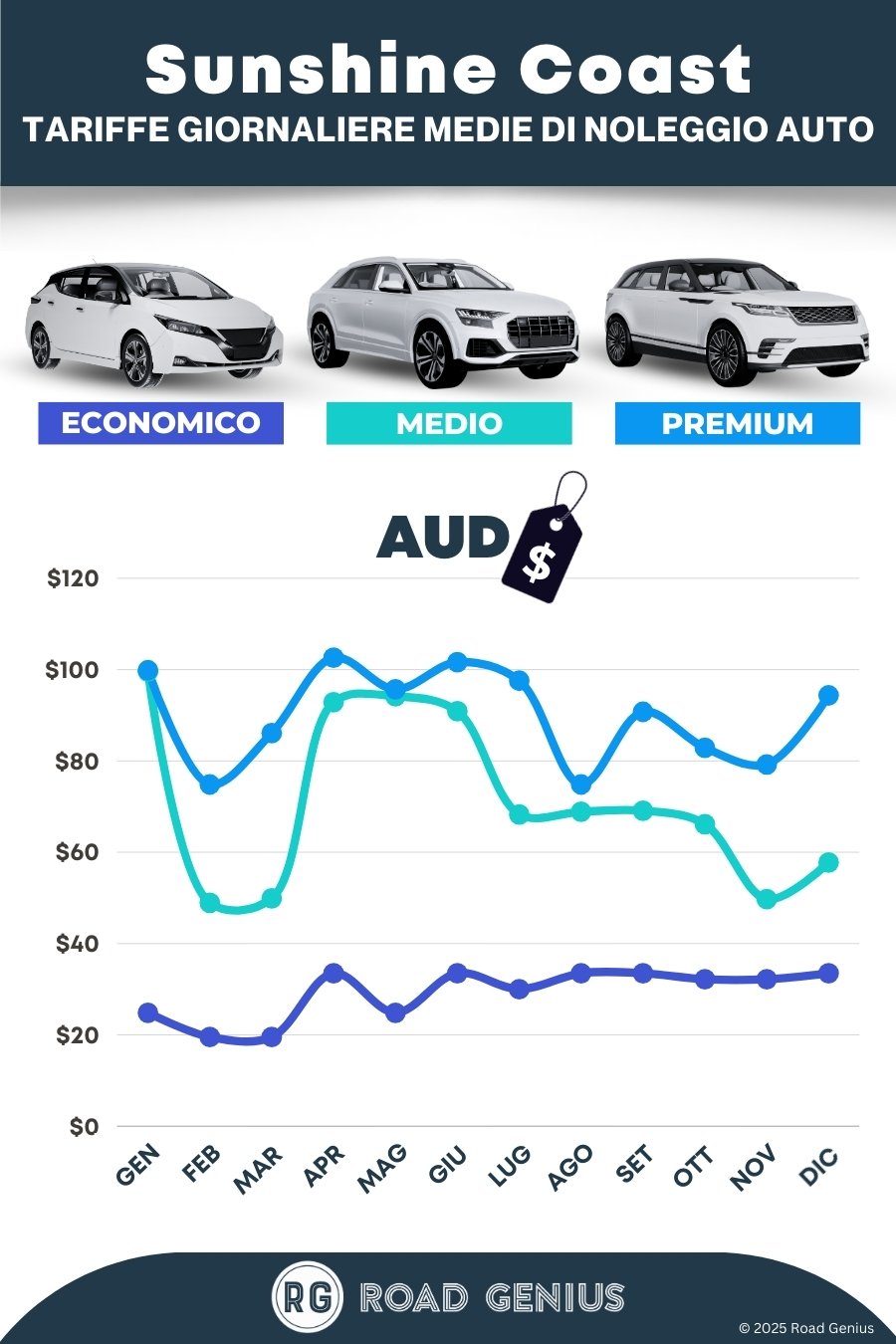In media, il noleggio di un’auto a Sunshine Coast costa circa AUD 79 al giorno, con tariffe a partire da AUD 20 al giorno.