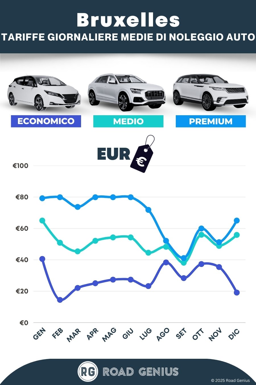 In media, il noleggio auto a Bruxelles costa circa €49 al giorno, con tariffe a partire da €14 al giorno.