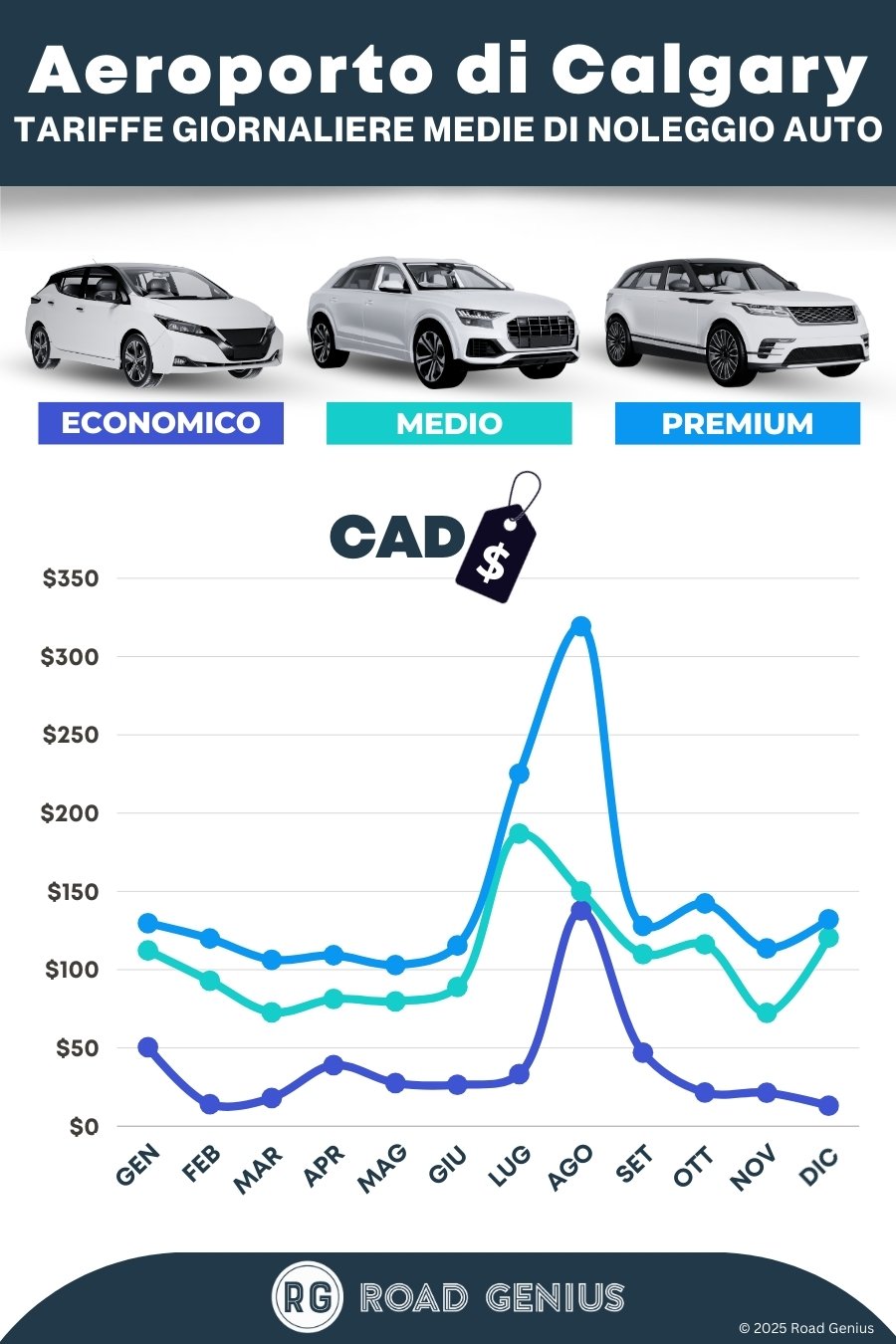 In media, il noleggio auto all'Aeroporto di Calgary costa circa CAD $97 al giorno, con tariffe a partire da CAD $13 al giorno.