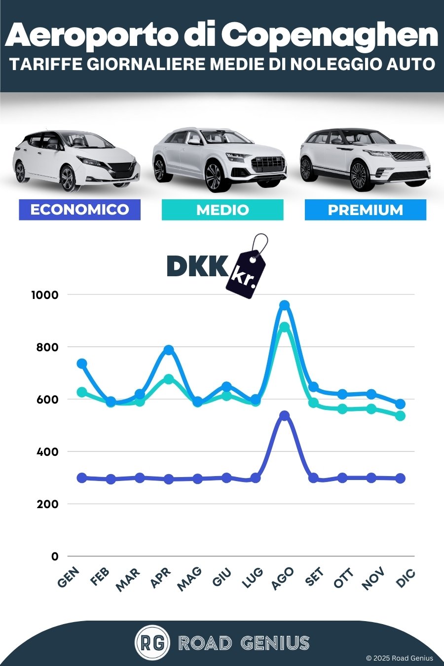 In media, il noleggio auto all'Aeroporto di Copenaghen costa circa 533 kr al giorno, con tariffe a partire da 294 kr al giorno.