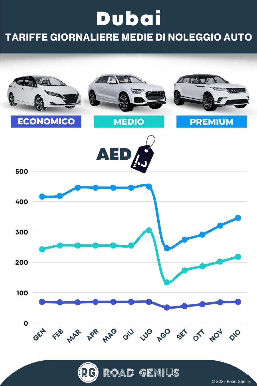 In media, il noleggio auto a Dubai costa circa 224 AED al giorno, con tariffe a partire da 51 AED al giorno.