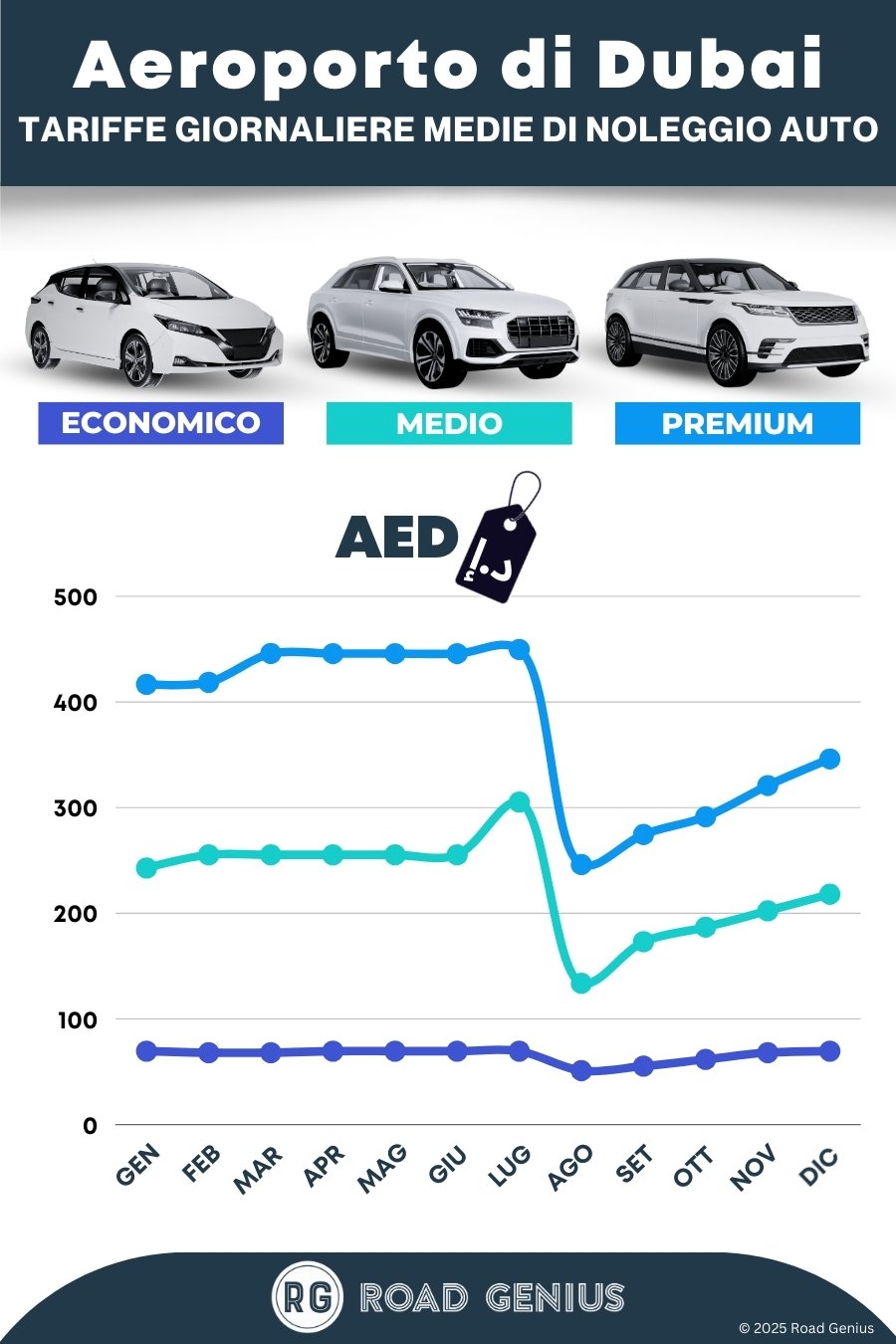 In media, il noleggio auto all'Aeroporto di Dubai costa circa 224 AED al giorno, con tariffe a partire da 51 AED al giorno.