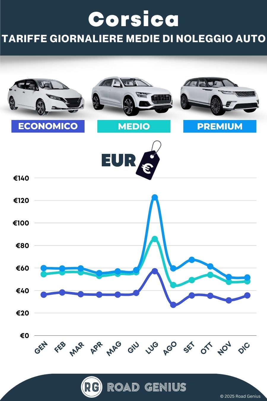 In media, il noleggio auto in Corsica costa circa €52 al giorno, con tariffe a partire da €27 al giorno.