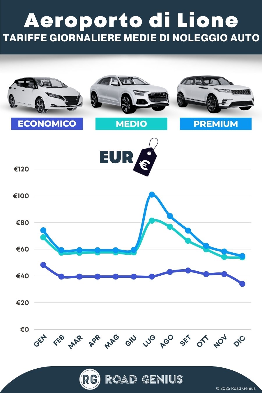 In media, il noleggio auto all'Aeroporto di Lione costa circa €57 al giorno, con tariffe a partire da €34 al giorno.
