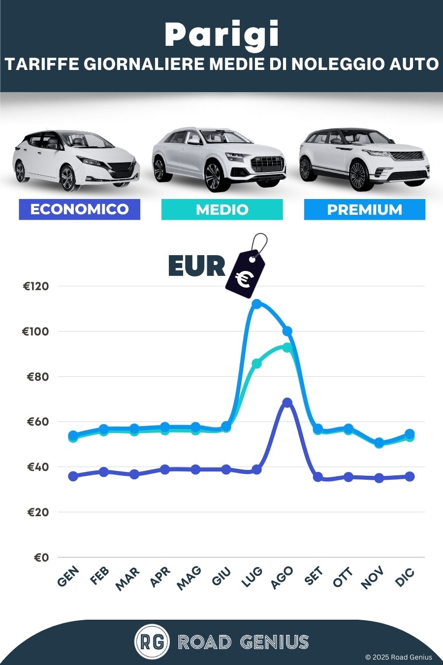 In media, il noleggio auto a Parigi costa circa €55 al giorno, con tariffe a partire da €35 al giorno.