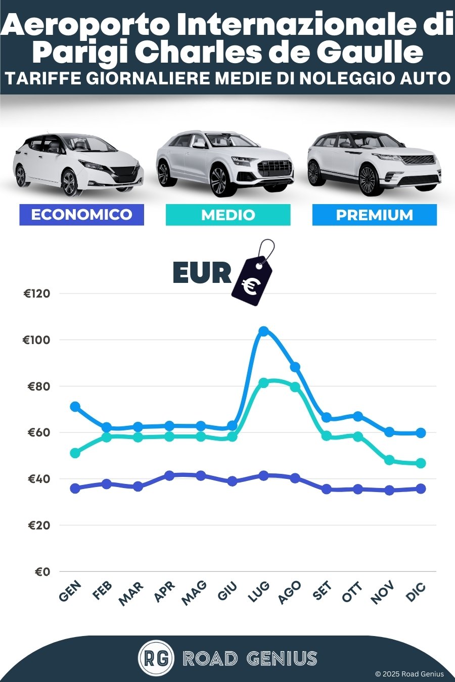 In media, il noleggio auto all'Aeroporto Charles de Gaulle di Parigi costa circa €56 al giorno, con tariffe a partire da €35 al giorno.