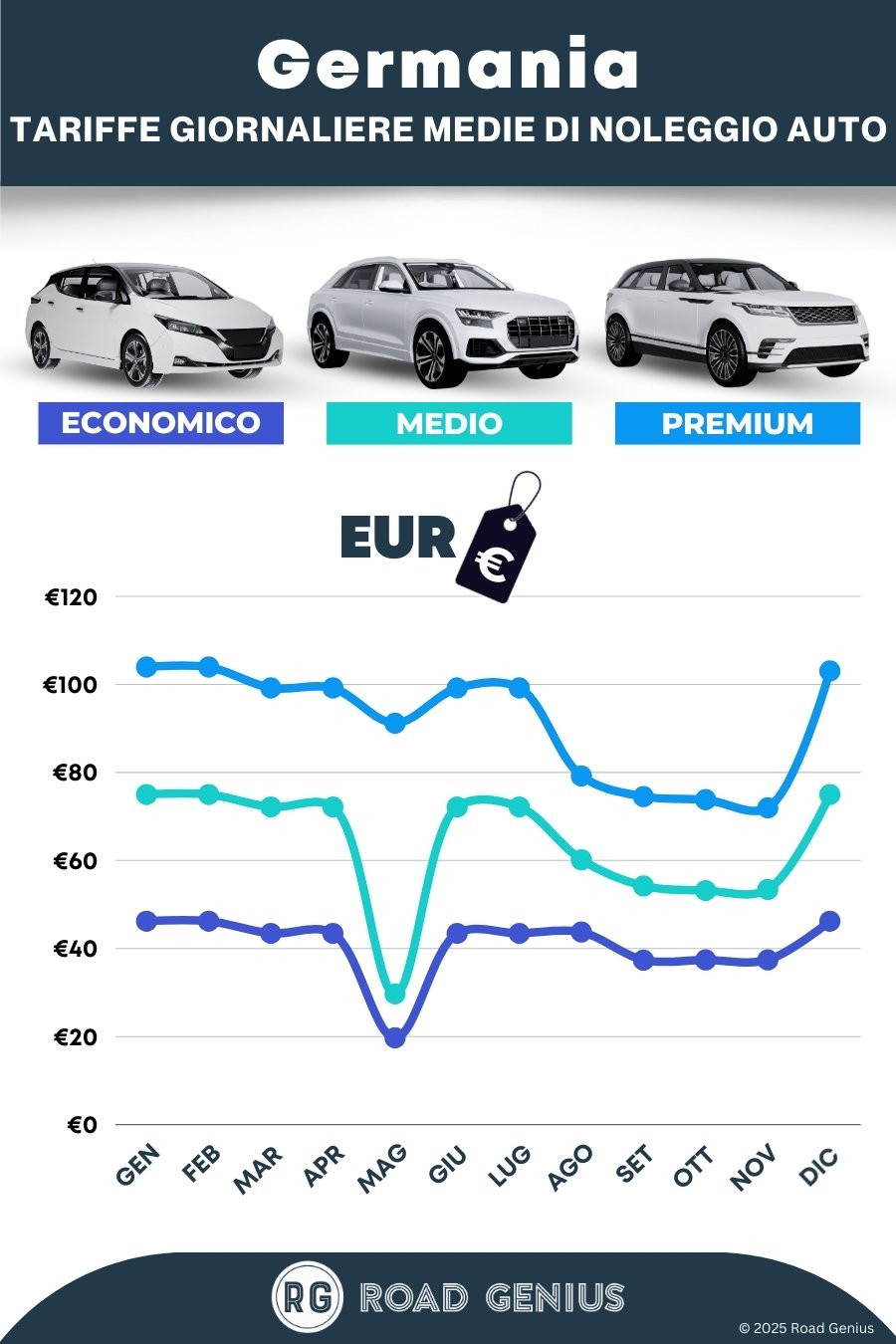 In media, il noleggio auto in Germania costa circa €65 al giorno, con tariffe a partire da €20 al giorno.