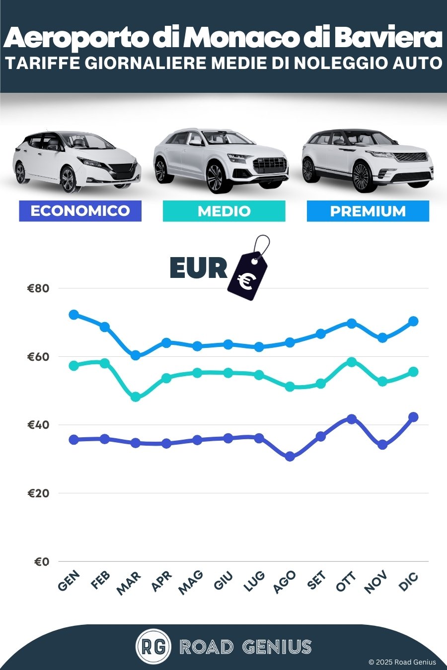 In media, il noleggio auto all'Aeroporto di Monaco di Baviera costa circa €52 al giorno, con tariffe a partire da €31 al giorno.