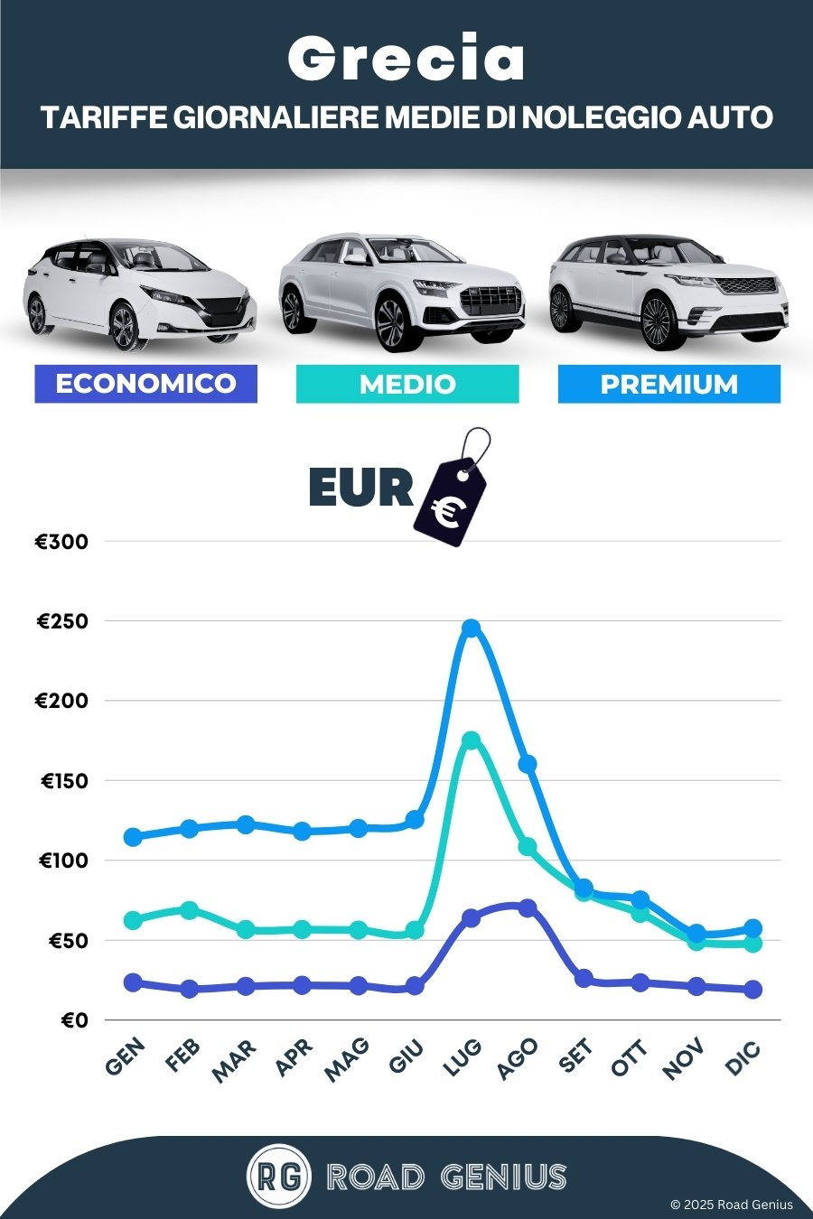 In media, il noleggio auto in Grecia costa circa €73 al giorno, con tariffe a partire da €19 al giorno.