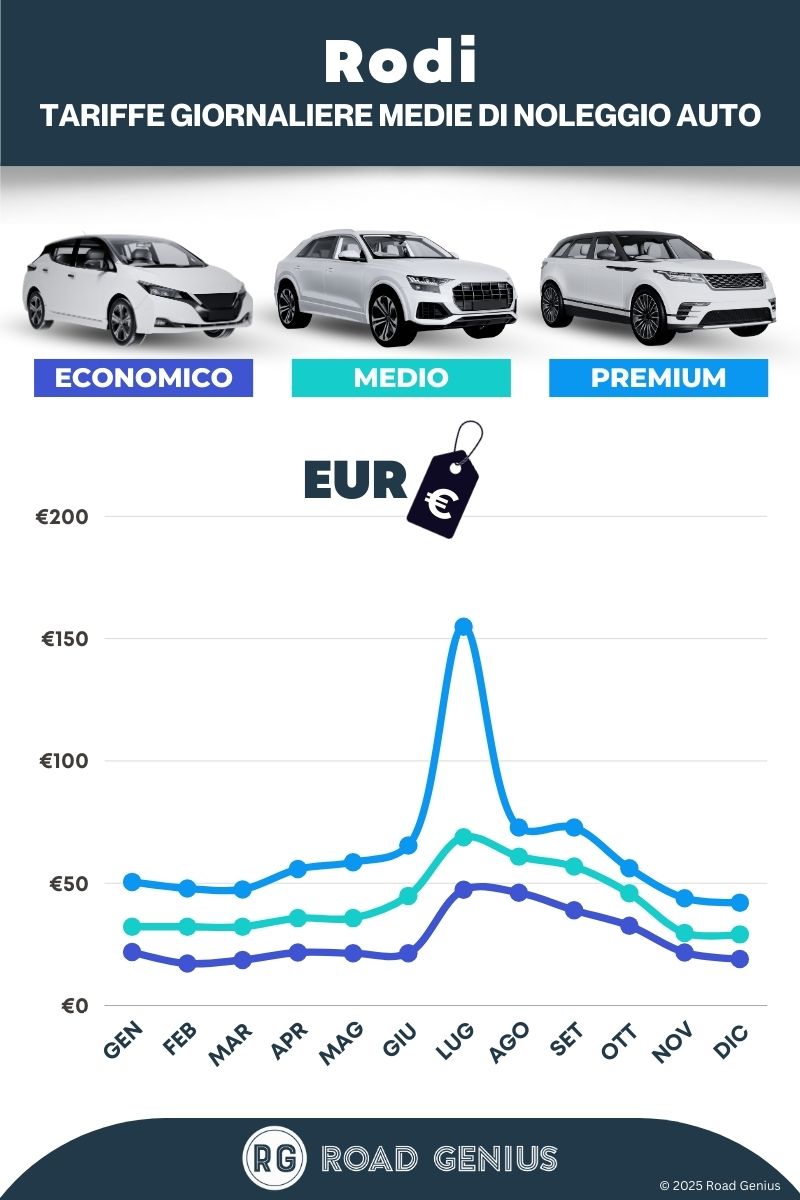 In media, il noleggio auto a Rodi costa circa €44 al giorno, con tariffe a partire da €17 al giorno.