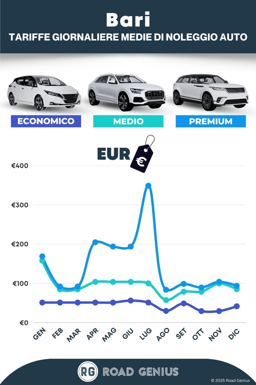 In media, il noleggio auto a Bari costa circa €96 al giorno, con tariffe a partire da €29 al giorno.