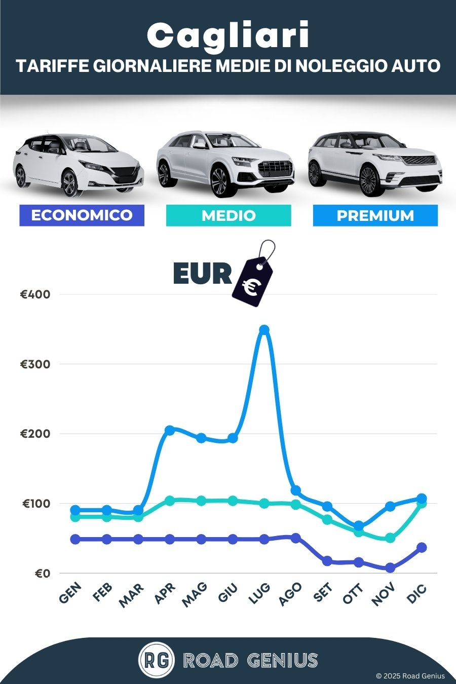 In media, il noleggio auto a Cagliari costa circa €89 al giorno, con tariffe a partire da €8 al giorno.