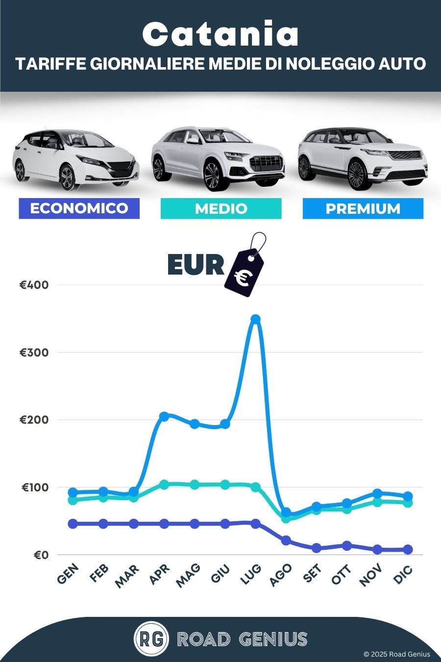 In media, il noleggio auto a Catania costa circa €83 al giorno, con tariffe a partire da €8 al giorno.