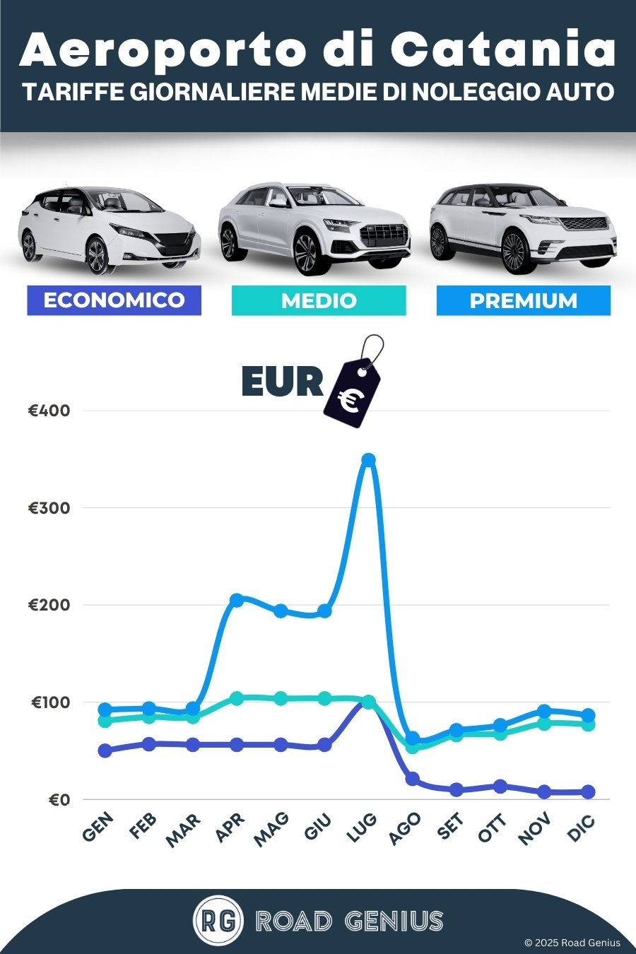 Con Road Genius, trovare un'auto a noleggio all'aeroporto di Catania (CTA) è semplice. Confronta decine di offerte in tutta Italia senza costi di prenotazione. Ritira l'auto direttamente in terminal e imbocca subito l'autostrada A18 per raggiungere Taormina, Siracusa e l'Etna. In alta stagione, consigliamo di prenotare in anticipo, soprattutto per auto con cambio automatico.