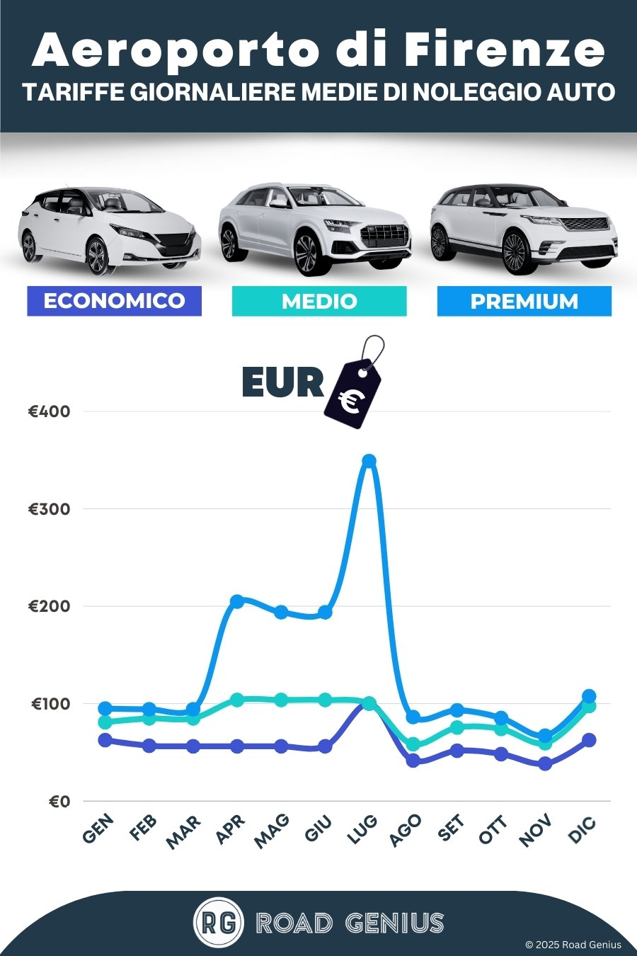 In media, il noleggio auto all'Aeroporto di Firenze costa circa €94 al giorno, con tariffe a partire da €38 al giorno.