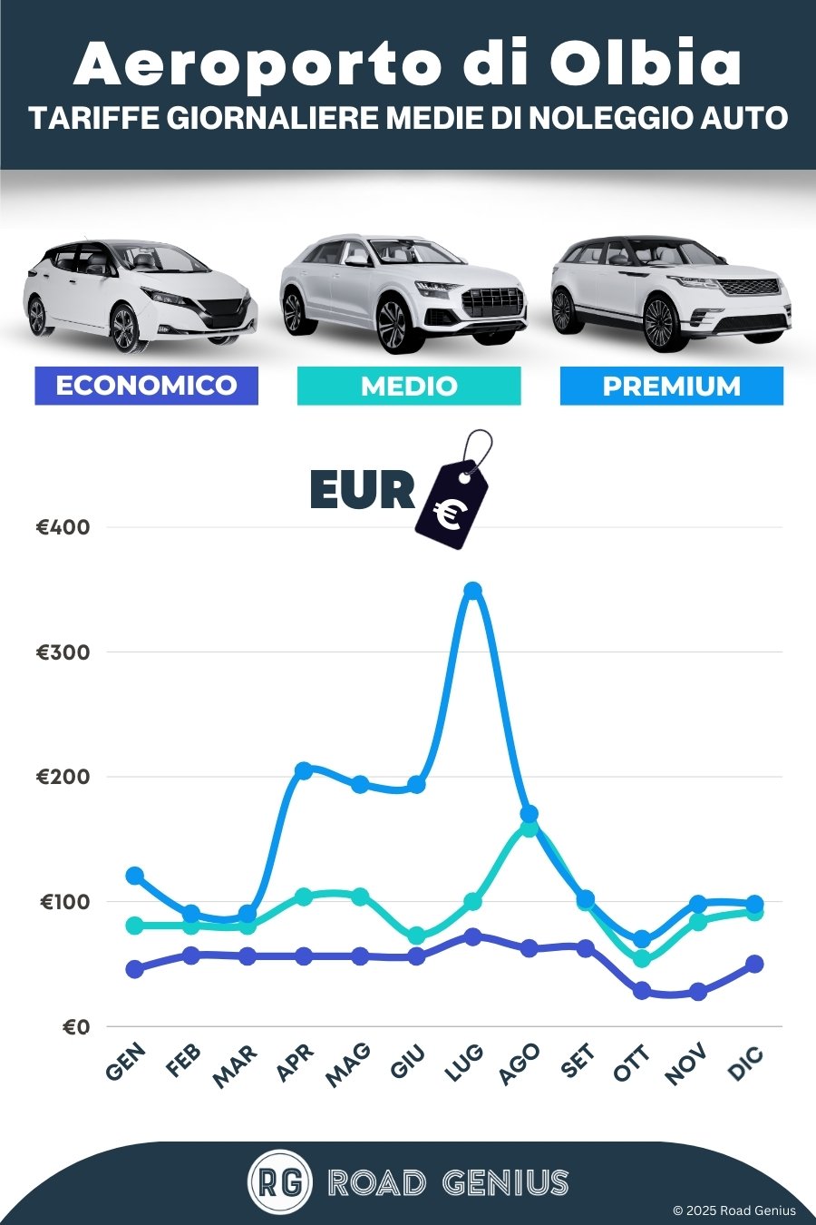 In media, il noleggio auto all'Aeroporto di Olbia costa circa €98 al giorno, con tariffe a partire da €28 al giorno.