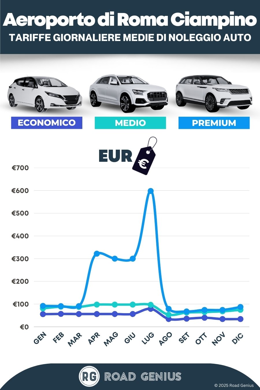 In media, il noleggio auto all'Aeroporto di Roma Ciampino costa circa €104 al giorno, con tariffe a partire da €34 al giorno.