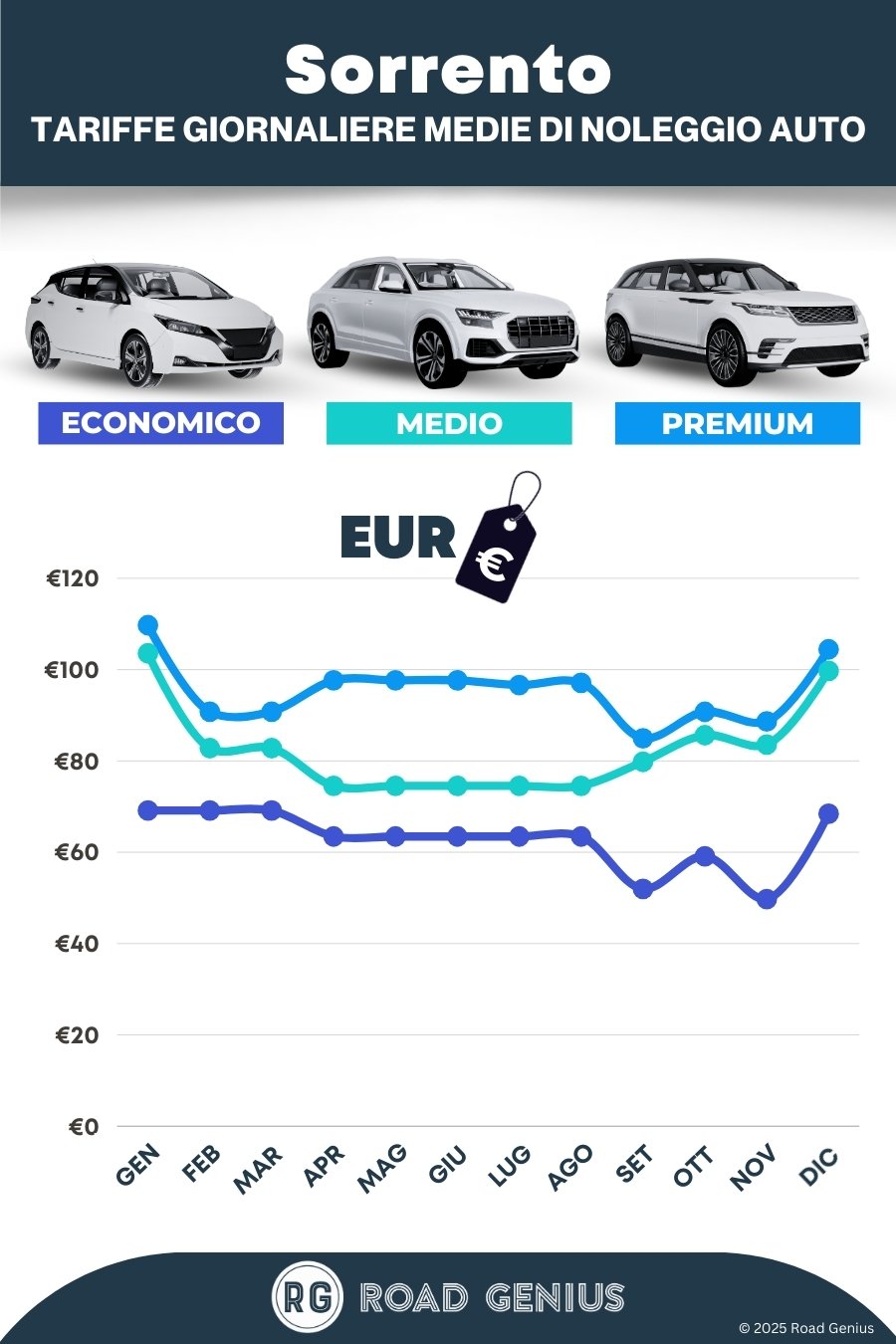 In media, il noleggio auto a Sorrento costa circa €80 al giorno, con tariffe a partire da €50 al giorno.