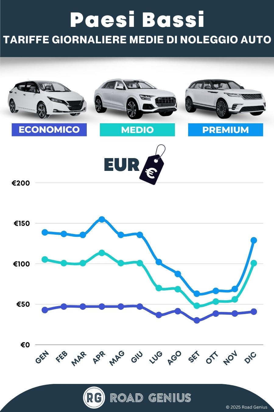 In media, il noleggio auto nei Paesi Bassi costa circa €80 al giorno, con tariffe a partire da €30 al giorno.