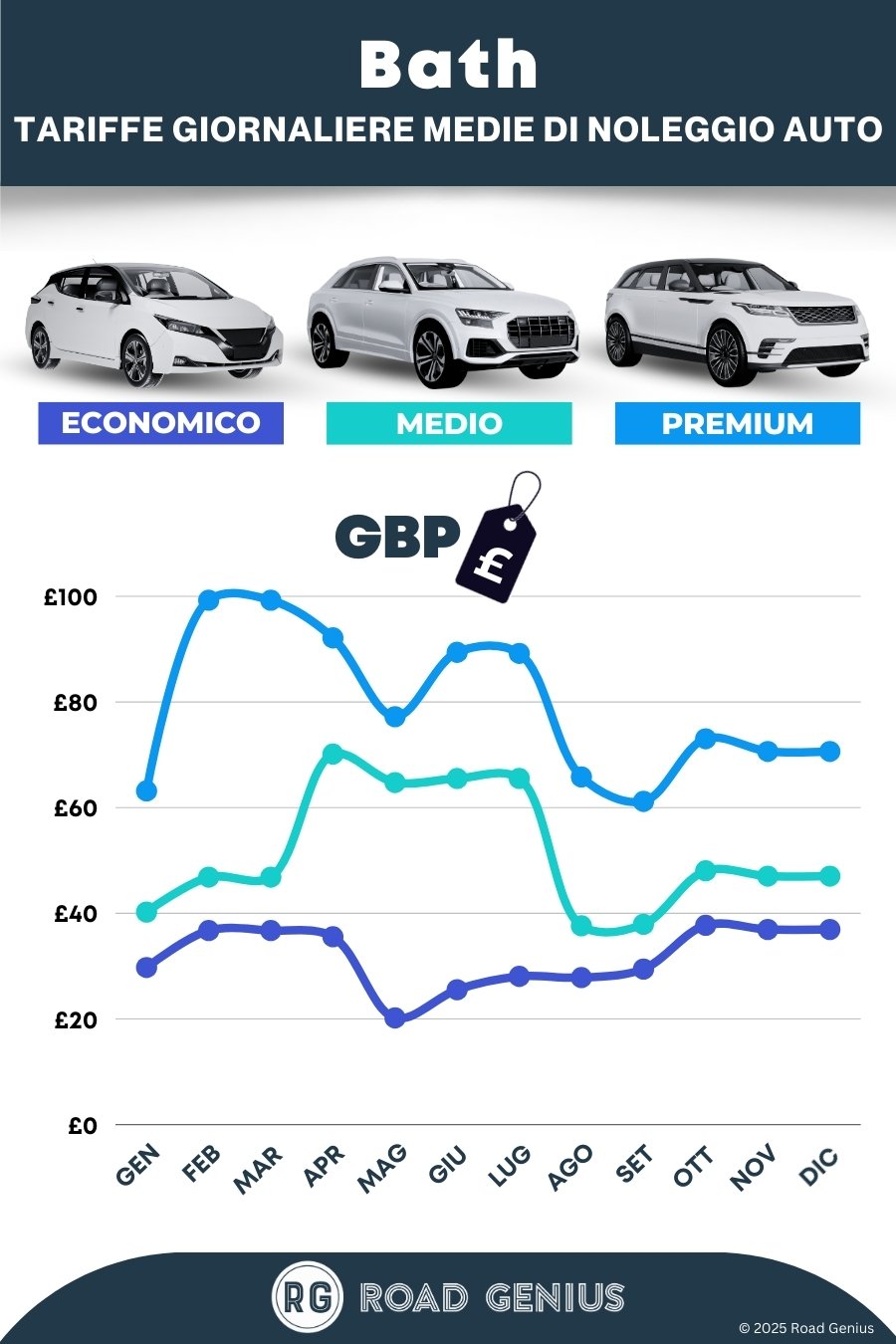 Sfrutta la stagionalità. Le tariffe aumentano tra luglio e agosto e durante il Mercatino di Natale di Bath. In questi periodi, e se cerchi un'auto automatica, prenota con largo anticipo. A gennaio le tariffe possono scendere del 30–50%. In genere, prenotare con circa 4 settimane di anticipo permette di trovare prezzi vantaggiosi.