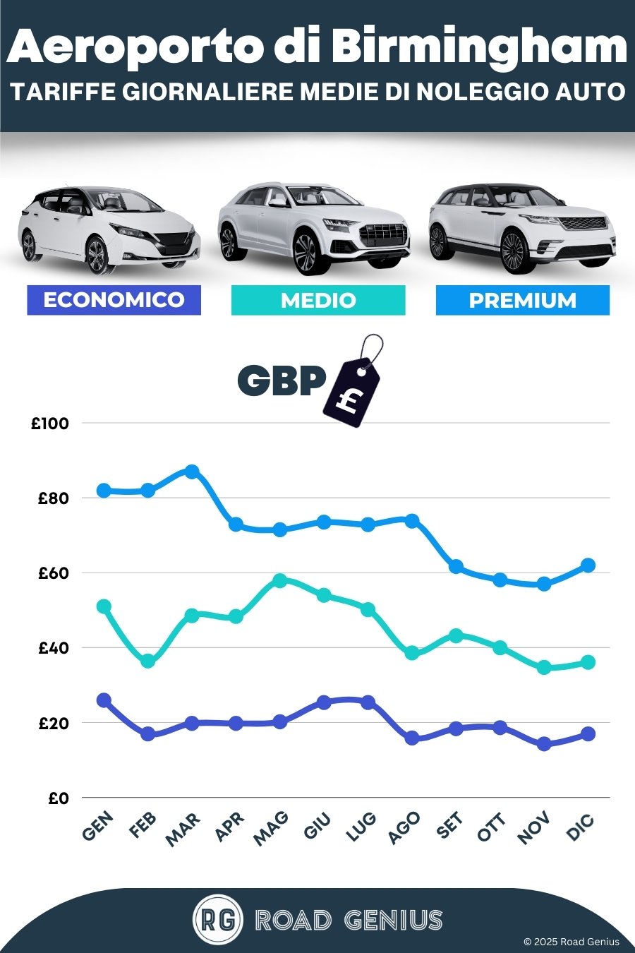 In media, il noleggio auto all'Aeroporto di Birmingham costa circa €45 al giorno, con tariffe a partire da €14 al giorno.