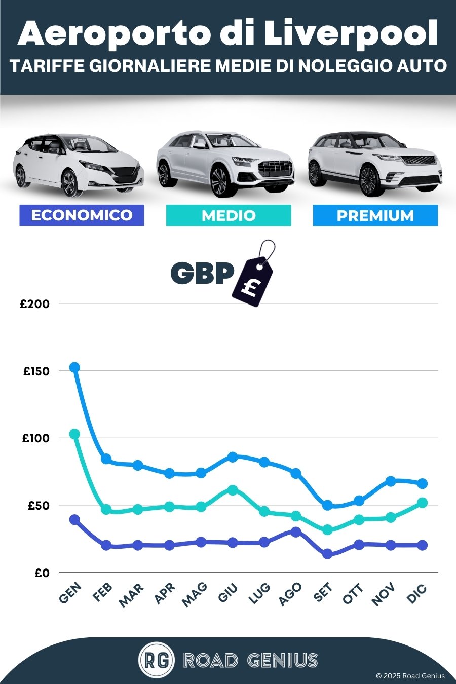 In media, il noleggio auto all'Aeroporto di Liverpool costa circa €51 al giorno, con tariffe a partire da €14 al giorno.