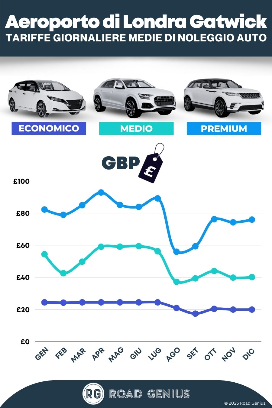In media, il noleggio auto all'Aeroporto di Londra Gatwick costa circa €50 al giorno, con tariffe a partire da €17 al giorno.