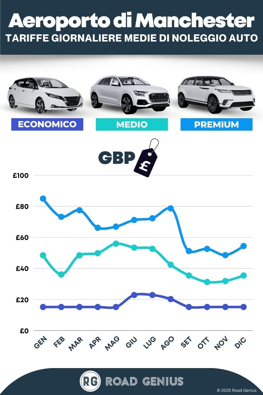 In media, il noleggio auto all'Aeroporto di Manchester costa circa €42 al giorno, con tariffe a partire da €15 al giorno.