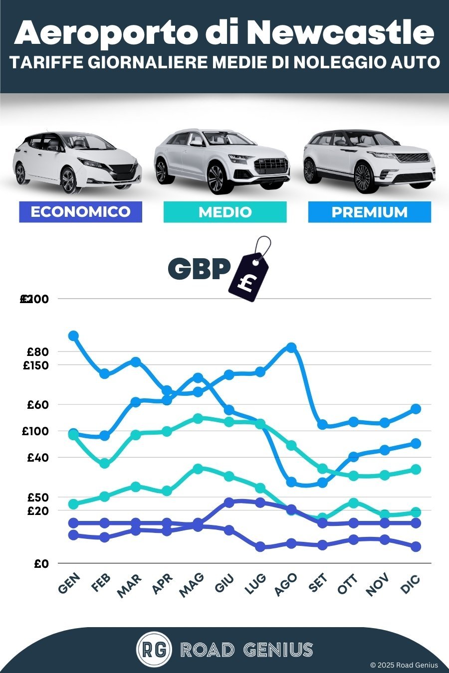 In media, il noleggio auto all'Aeroporto di Newcastle costa circa €55 al giorno, con tariffe a partire da €12 al giorno.
