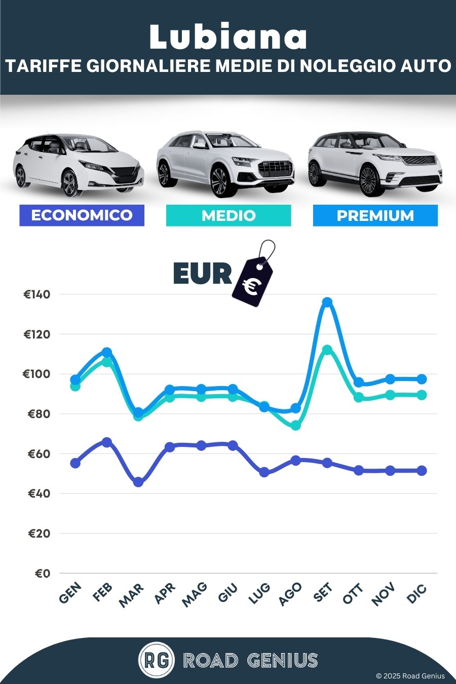 In media, il noleggio auto a Lubiana costa circa €81 al giorno, con tariffe a partire da €46 al giorno.
