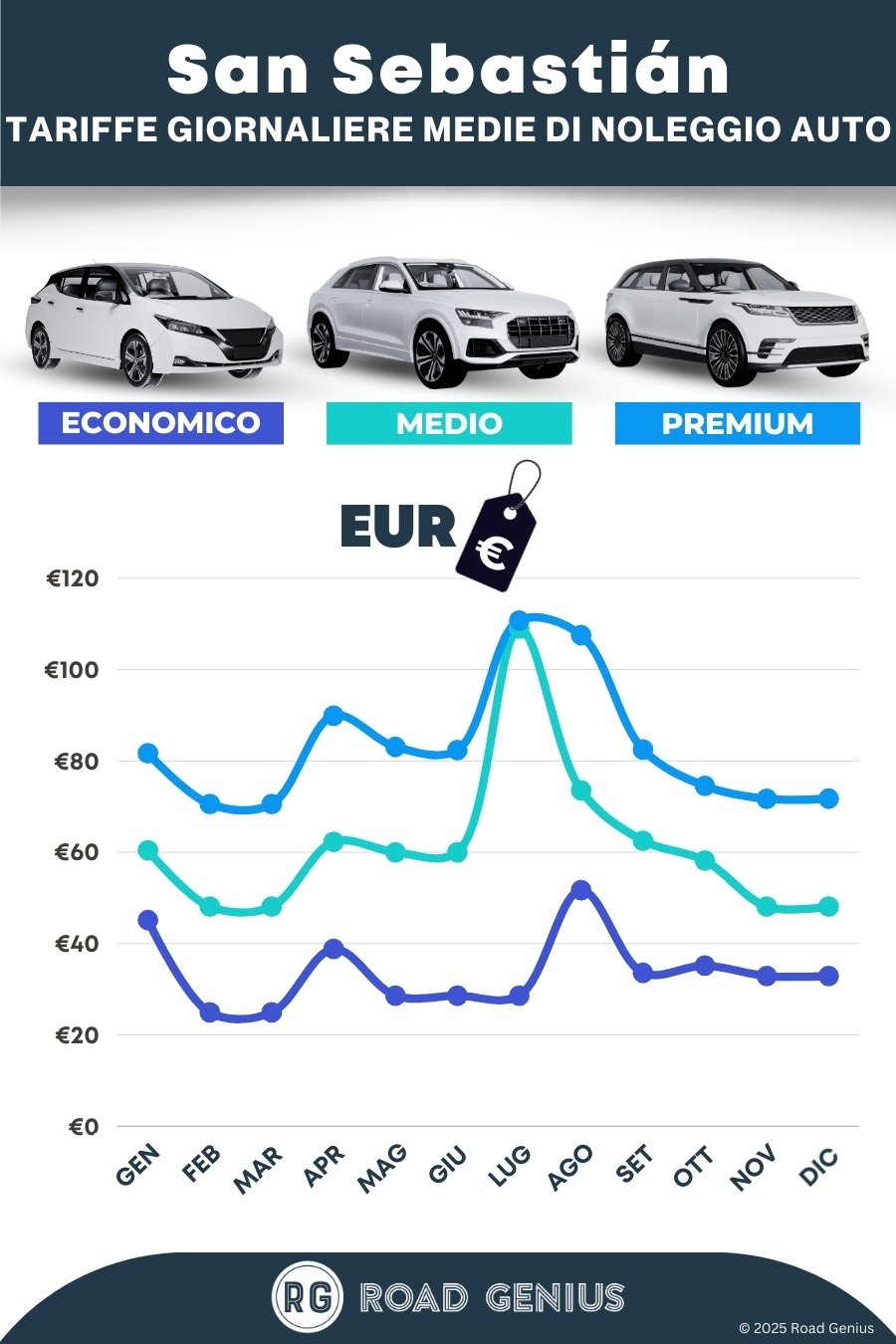 In media, il noleggio auto a San Sebastián costa circa €59 al giorno, con tariffe a partire da €25 al giorno.