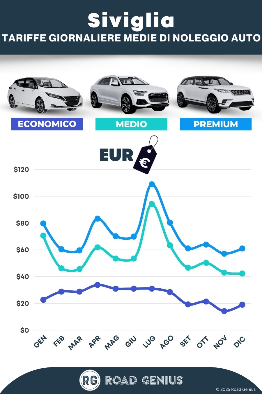In media, il noleggio auto a Siviglia costa circa €51 al giorno, con tariffe a partire da €14 al giorno.