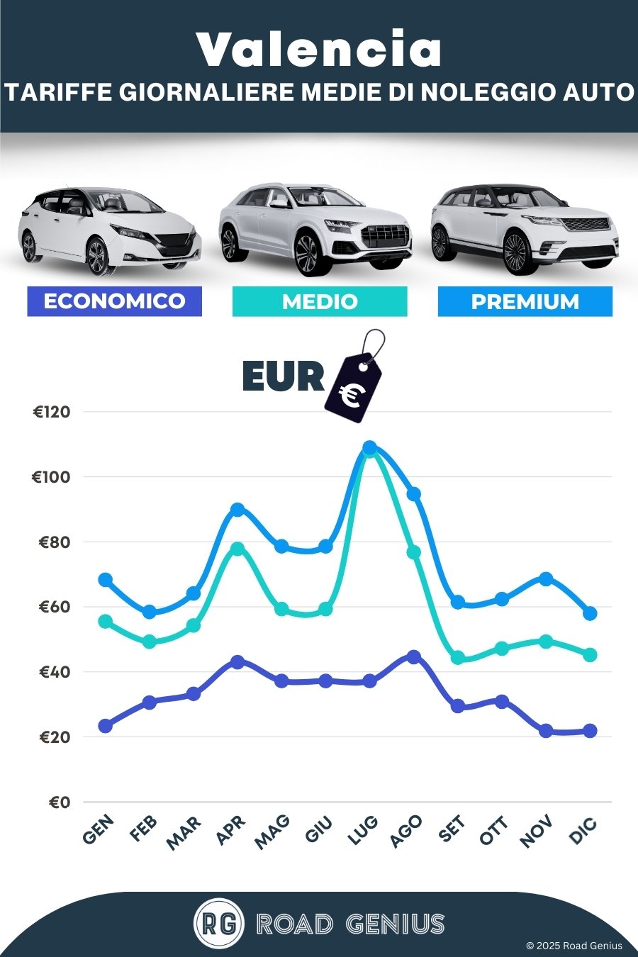 In media, il noleggio auto a Valencia costa circa €56 al giorno, con tariffe a partire da €22 al giorno.