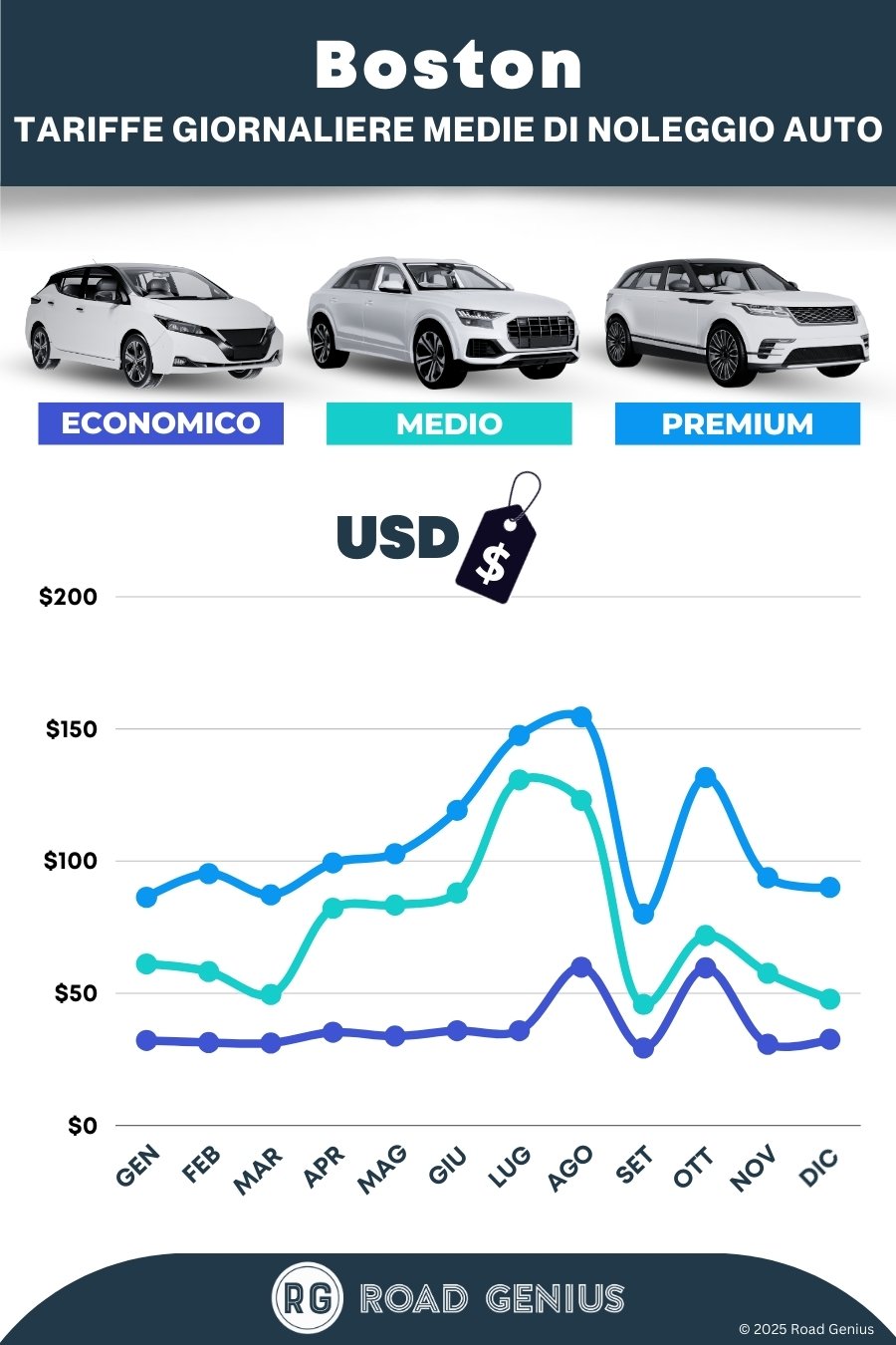 In media, il noleggio auto a Boston costa circa USD $73 al giorno, con tariffe a partire da USD $29 al giorno.