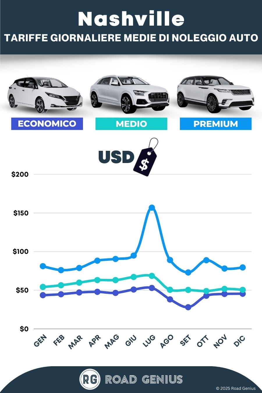 In media, il noleggio auto a Nashville costa circa USD $64 al giorno, con tariffe a partire da USD $28 al giorno.