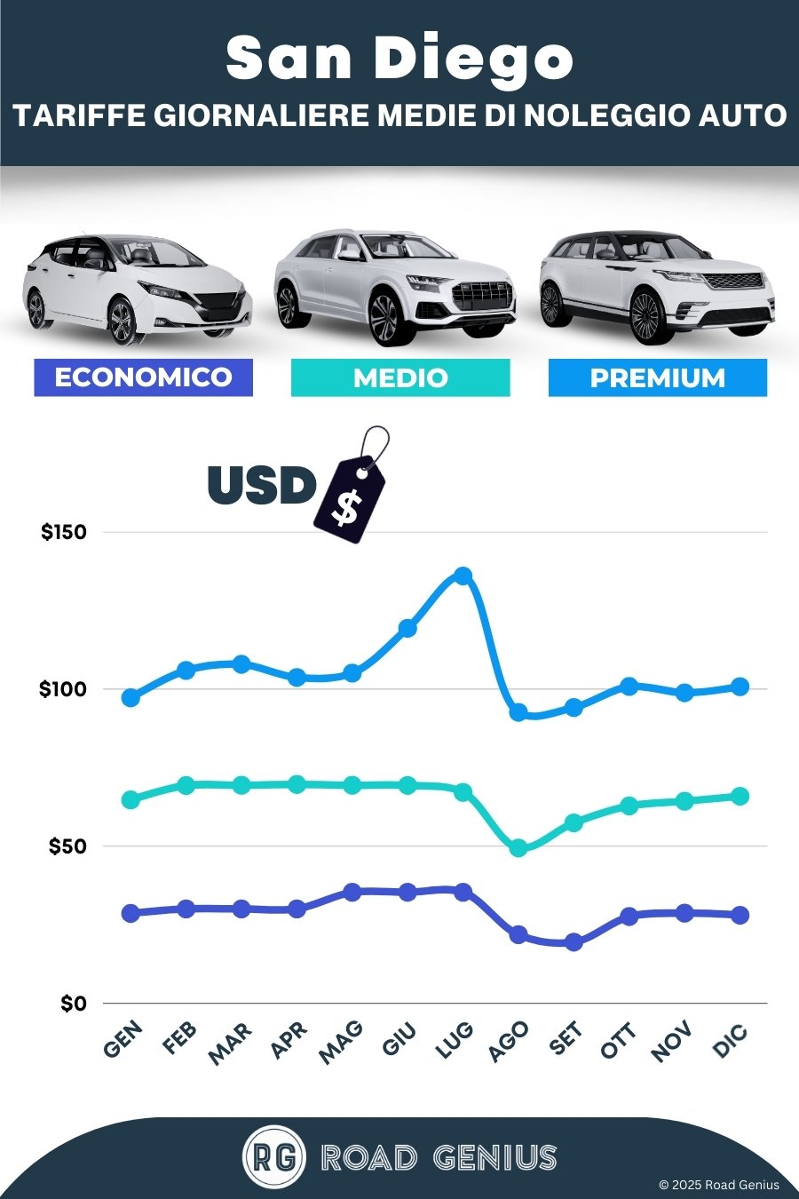 In media, il noleggio auto a San Diego costa circa USD $66 al giorno, con tariffe a partire da USD $19 al giorno.