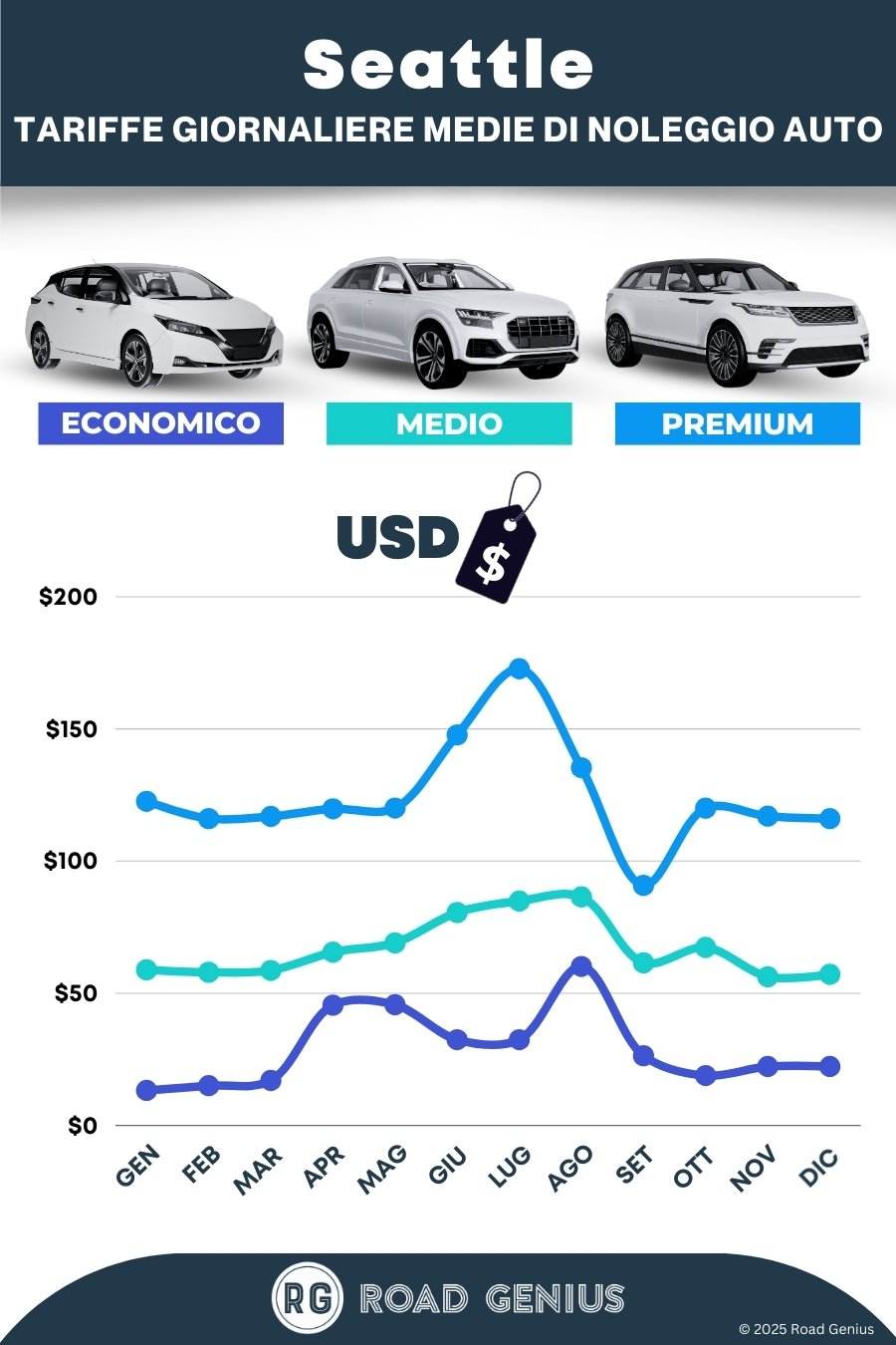 In media, il noleggio auto a Seattle costa circa USD $74 al giorno, con tariffe a partire da USD $13 al giorno.