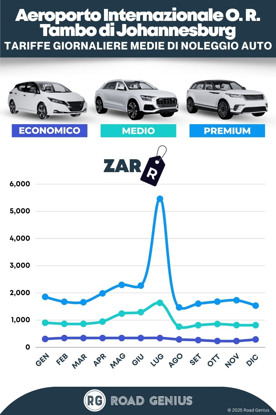 In media, il noleggio auto all'Aeroporto O.R. Tambo di Johannesburg costa circa ZAR 1.128 al giorno, con tariffe a partire da ZAR 230 al giorno.